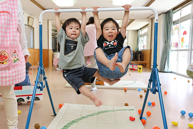 元気一杯のトレーナーと一緒にさまざまな運動遊びを通して、ケガをしにくい体づくりを目指します。鉄棒や跳び箱も大人気です。