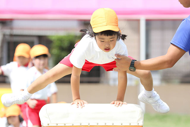 元気一杯のトレーナーと一緒にさまざまな運動遊びを通して、ケガをしにくい体づくりを目指します。鉄棒や跳び箱も大人気です。
