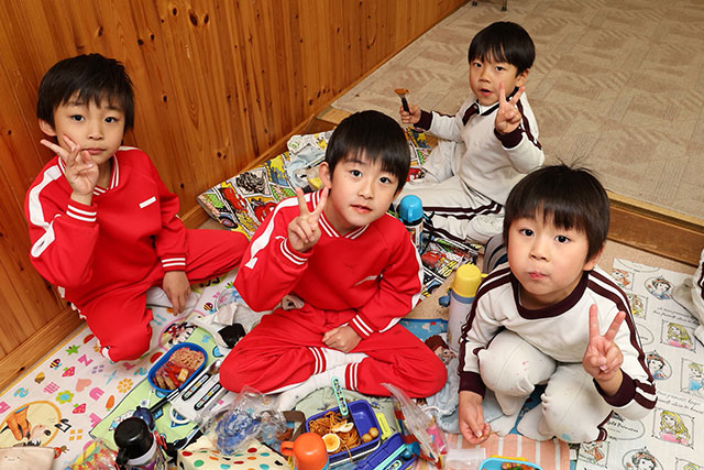 3歳児クラスです。幼児教育として本格的な集団生活の始まりです。 お兄さんお姉さんの真似をしながらたくましく成長しています。